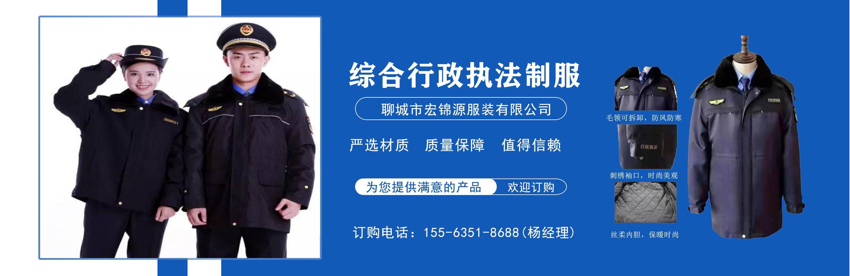 聊城市宏錦源服裝有限公司位于江北水城—山東聊城,地理位置優(yōu)越,交通便利。公司主營綜合行政執(zhí)法制服,交通執(zhí)法服裝,應(yīng)急管理執(zhí)法標(biāo)志服,市場監(jiān)督管理標(biāo)志服,農(nóng)業(yè)執(zhí)法服裝,生態(tài)環(huán)境保護(hù)制服,文化市場執(zhí)法服,城管標(biāo)志服裝廠,衛(wèi)生監(jiān)督制服,六部門標(biāo)志服廠家等,值得信賴! 公司生產(chǎn)的標(biāo)志服裝據(jù)有造型美、板型新、多次水洗不退色、不變型、不起泡。 “認(rèn)真辦事,踏實(shí)做人”是宏錦源的企業(yè)精神,我們的宗旨是:“用服務(wù)與真誠來換取你的信任與支持,互惠互利,共創(chuàng)雙贏!”我公司愿與國內(nèi)外各界同仁志士竭誠合作,共創(chuàng)未來企業(yè)目標(biāo):在已選定的服飾領(lǐng)域中,成為行業(yè)的卓越者。 經(jīng)營理念:追求產(chǎn)品卓越,為用戶提供完美、高效的服務(wù)。...